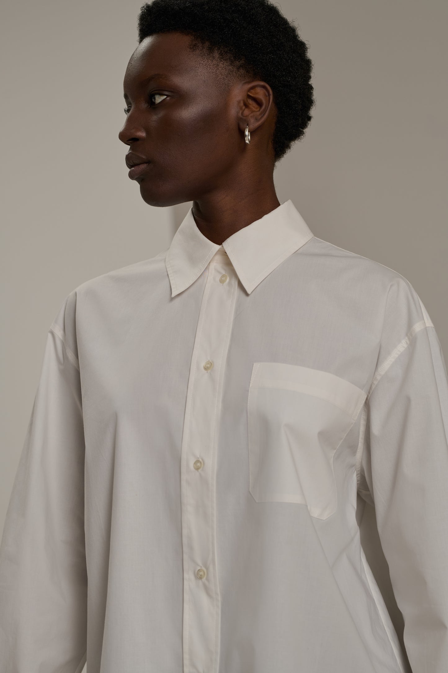 CARLOTTA is an off-white poplin shirt featuring an oversized fit inspired by men's wardrobes, offering a casual yet elegant style.